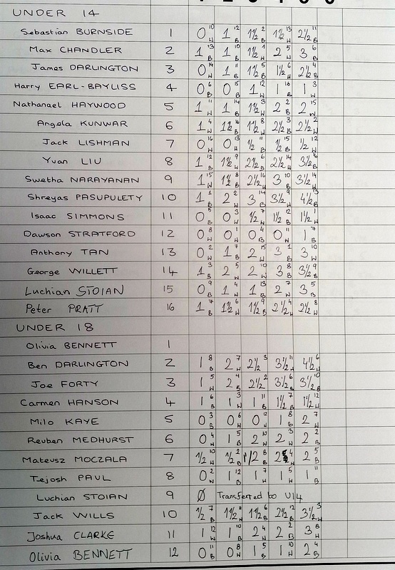 U18: 1st: Ben Darlington 4½/5; 2nd* Joe Forty 3½/5; 3rd* Jack Wills 3½/5